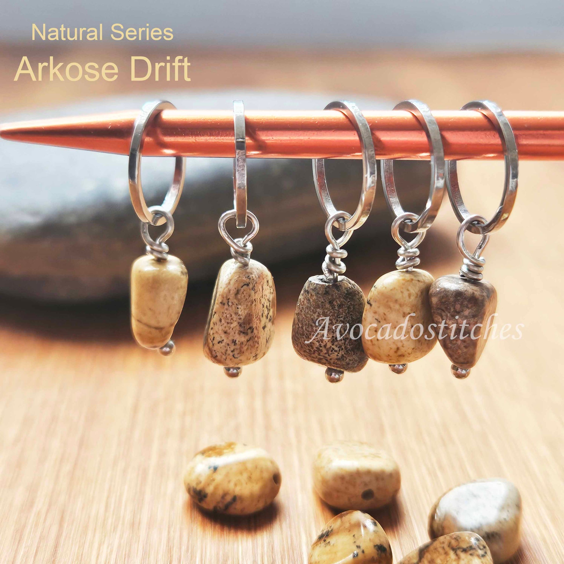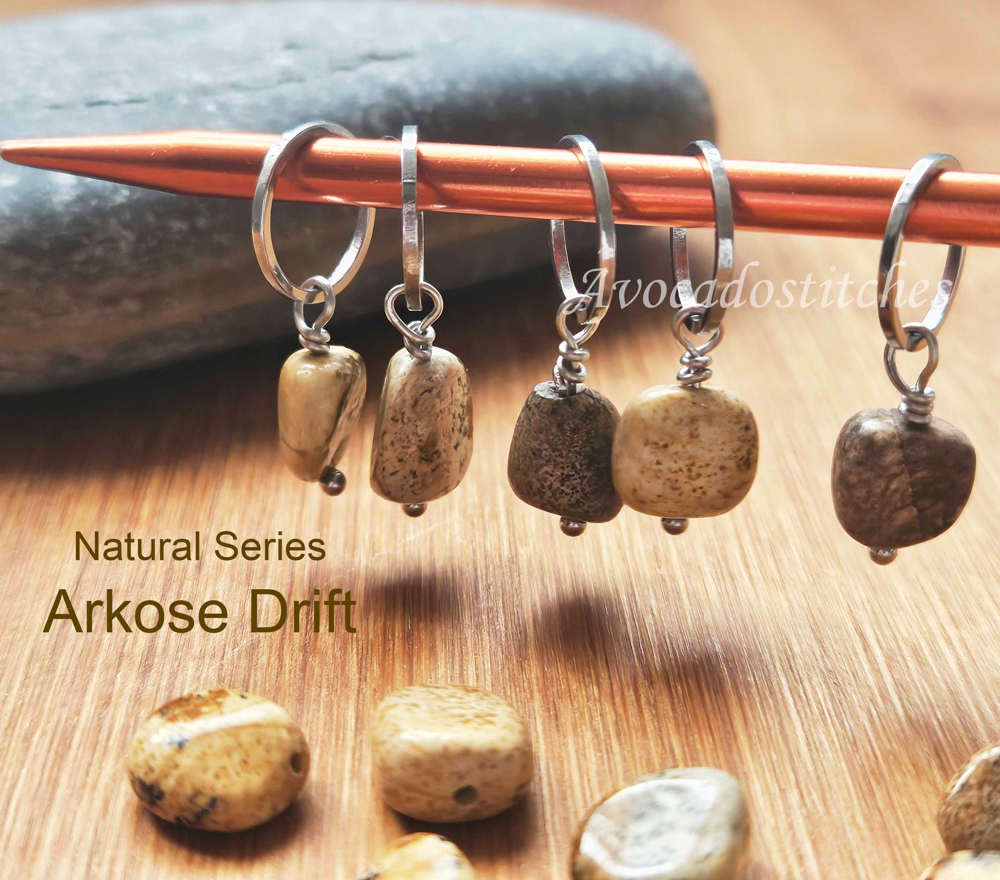 *Add a touch of earthy elegance to your knitting with Arkose Drift—a set of stitch markers crafted from naturally irregular arkose sandstone. Each stone carries its own unique shape, size, and color, making every set one-of-a-kind.