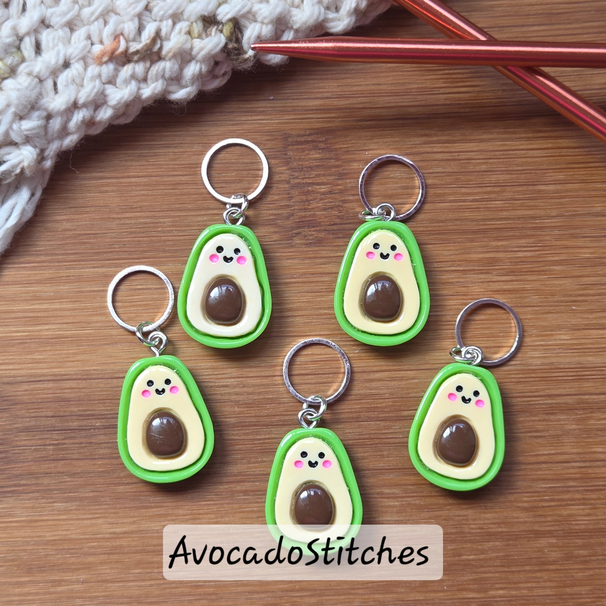 Bring a splash of green goodness to your project with this adorable set of 5 avocado stitch markers! These cute little avocados, complete with tiny pits and smiles, are made from acrylic—perfect for adding a touch of fun and functionality to your knitting or crochet sessions.