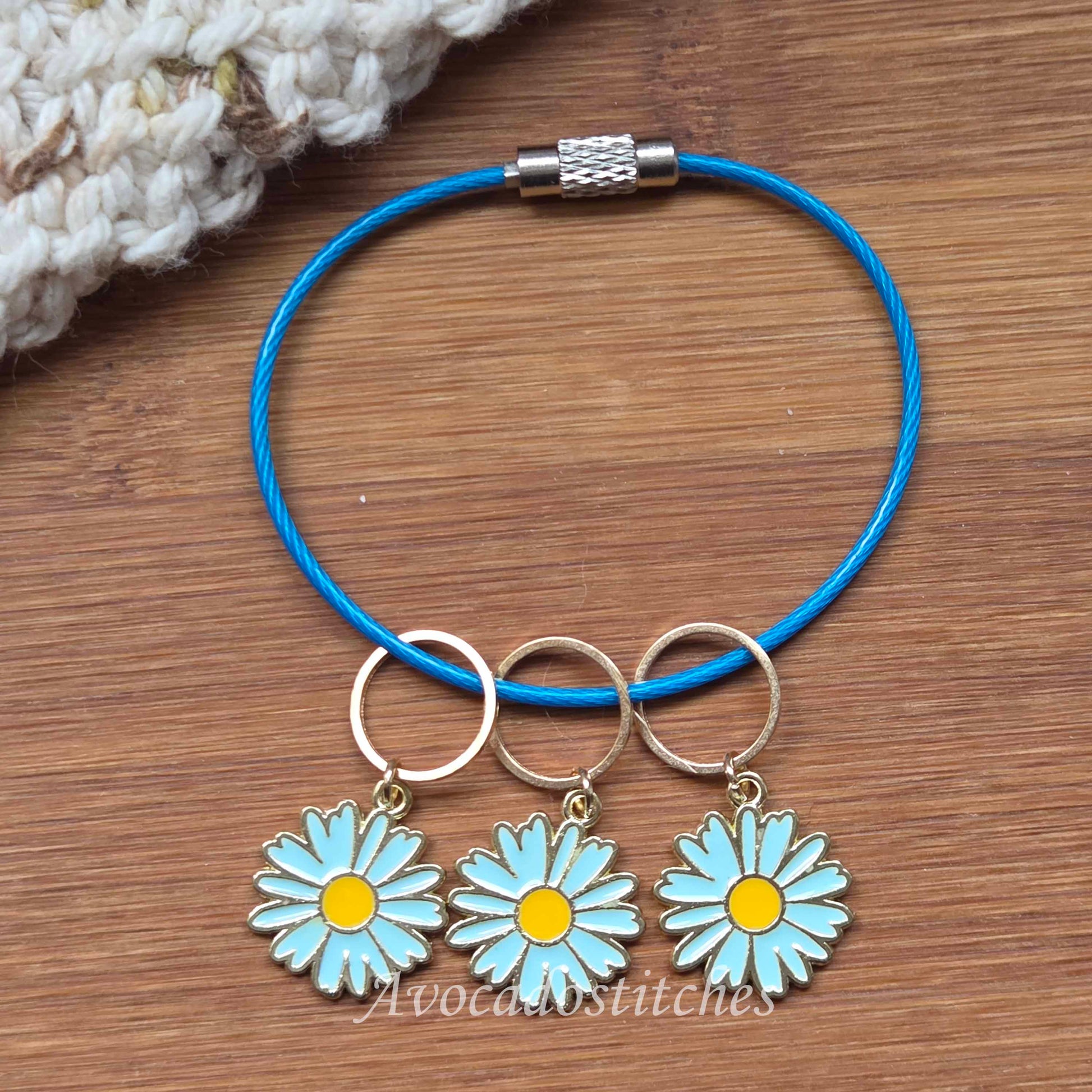 BLUE DAISY – 4 pieces / Knitting Crochet Stitch Markers with Stainless Steel Chain Holder / Notions