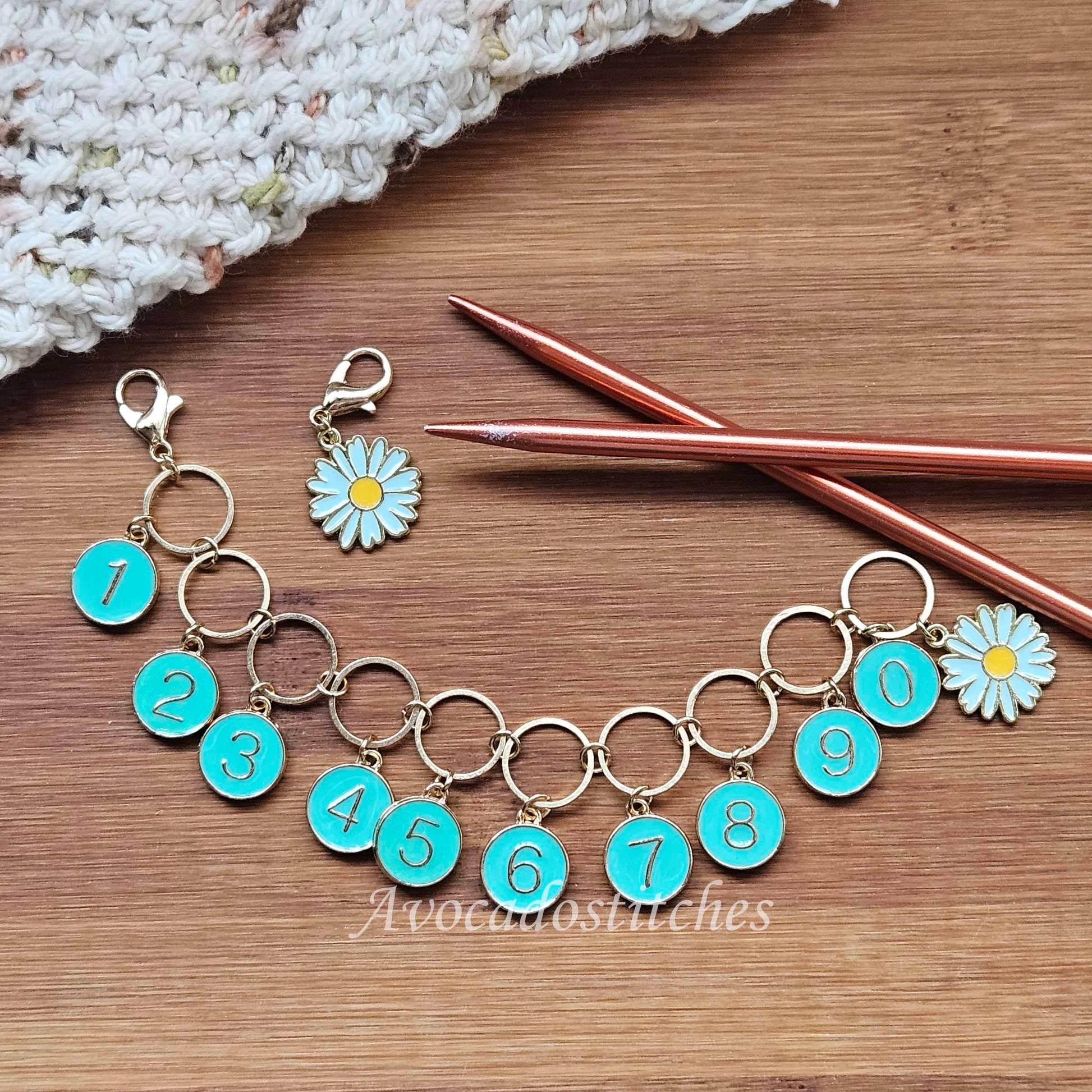 This listing includes one numbered row counter chain (#1–#0) and one stitch marker with a lobster clasp.